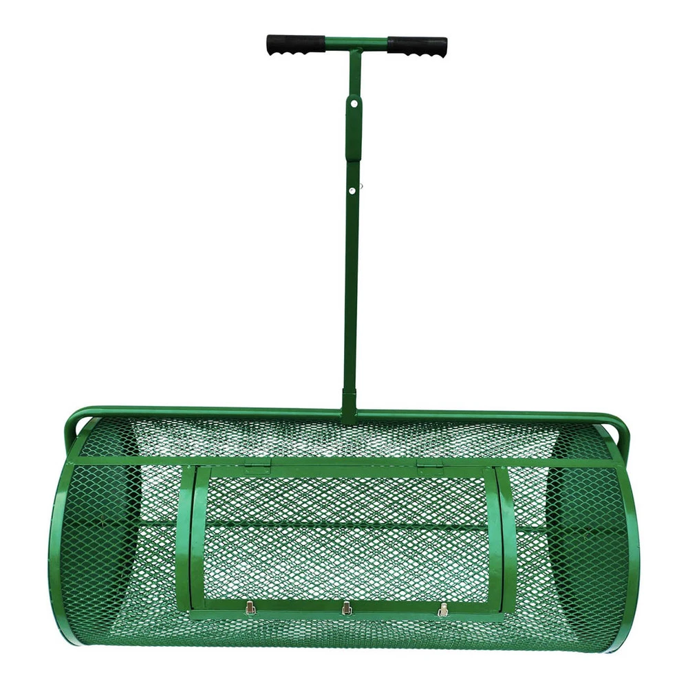 Featuring an all-steel construction based upon a traditional hand-pulled roller design, this lightweight Landzie Compost & Peat Moss Spreaders has a mesh basket with 3/4 inch by 1/2 inch diamond-shaped holes that evenly distributes your compost, peat moss or topdressing material in consistent layers as it rolls along. The mesh filters out the large compost debris which stays in the basket and doesn’t go on your lawn.